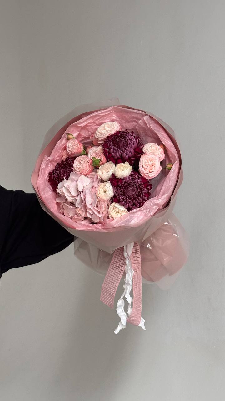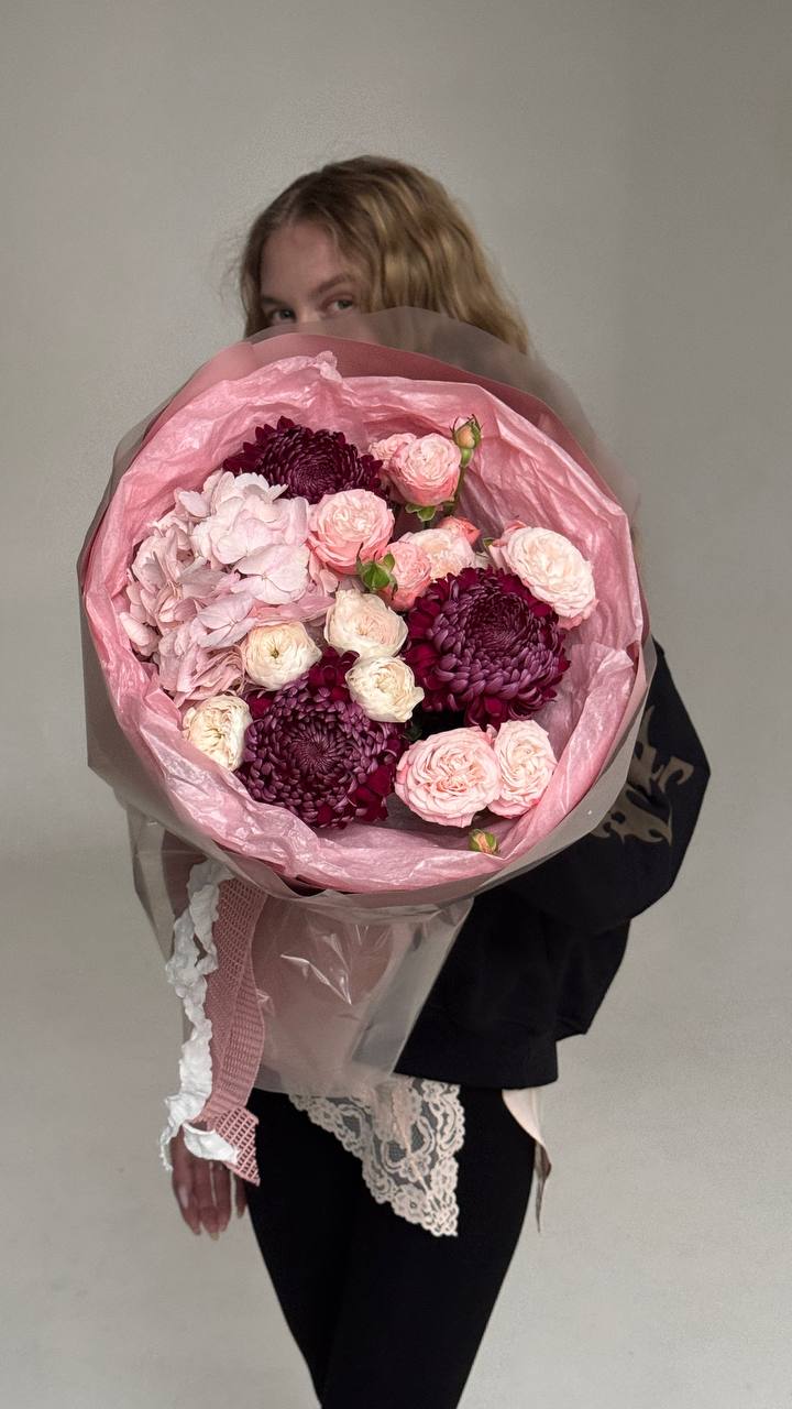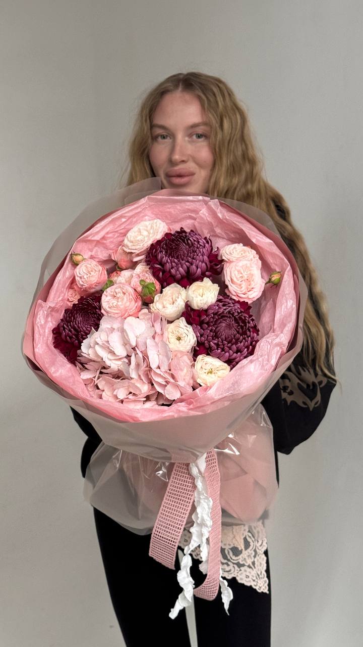 Букет из гортензии, кустовых роз и хризантем
